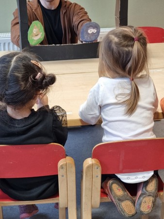Det ble rød gruppe som ble med på dukketeateret, og med ett gjenkjennelig narrativ; babblarna måtte tisse, vaske hender, tørke hendene sine og spise mat. Deretter måtte de løpe av sted! Plutselig så datt Bobbo! Uffa meg, da var det godt med litt kos fra Babba. Barna fulgte nøye med og sammen med barna skal vi fortsette å utforske babblarnas verden. Etter dukketeater var det skikkelig stas å få ta og kjenne på en babblarna dukke», og siden disse tros alt lignet en god del på is», så da må vi selvfølgelig late som at vi spiser is! Det er alltid herlig å se hva barna kommer fram til i sine utforskningsprosesser og med hver sine kognitive skjemaer»- hva de ulike tingene minner dem om, ja da ser vi virkelig kompetansen til barna våre.